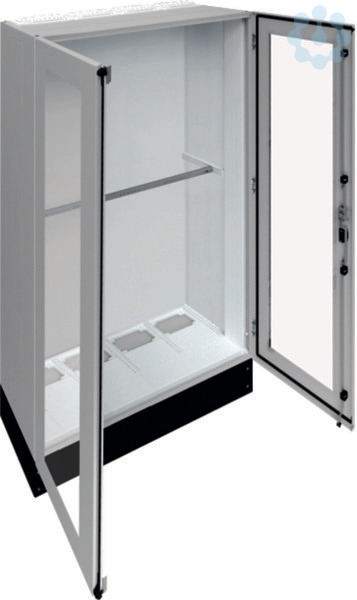 Schrank, univers, IP55/II, 1850x1050x400mm + 200mm Sockel. Einzelstandverteiler für die Innenraummontage mit VDE-Gutachten (Fertigungsüberwachung) nach DIN EN 61439-1/-2/-3 und Maßnorm DIN 43 870, zur Aufputz Montage. Zum Aufbau einer Niederspannungsverteilung bis 800 A, 3AC 230/400 V 50 Hz. Schutzart IP55, Schutzklasse I oder II, Luft- und Kriechstrecken nach DIN VDE 0110-1/-2. Bestehend aus Schrank mit Tür aus pulverbeschichtetem, eingebranntem, profiliertem 1,5 mm dicken Stahlblech. Durchsteckflansche oben, unten offen (Leitungseinfügungen einbaubar). Sammelschienendurchführungen als seitliche Vorprägung. Tür aufliegend, mit innen liegenden Scharnieren, Türanschlag standardmäßig rechts, wechselbar, mit 110 Grad Öffnungswinkel. Serienmässig mit Schwenkhebelverschluss, DIN-Profil-Halbzylinder einbaubar. Waagerechte Abfangschiene zur stabilisierung im Schrank enthalten. Türdichtung umlaufend geschäumt, temperaturbeständig und ölbeständig. Sockelleiste (Höhe 200 mm) serienmäßig montiert mit abnehmbarer Frontbl