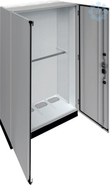 Schrank, univers, IP55/II, 1850x1050x400mm + 100mm Sockel. Einzelstandverteiler für die Innenraummontage mit VDE-Gutachten (Fertigungsüberwachung) nach DIN EN 61439-1/-2/-3 und Maßnorm DIN 43 870, zur Aufputz Montage. Zum Aufbau einer Niederspannungsverteilung bis 800 A, 3AC 230/400 V 50 Hz. Schutzart IP55, Schutzklasse I oder II, Luft- und Kriechstrecken nach DIN VDE 0110-1/-2. Bestehend aus Schrank mit Tür aus pulverbeschichtetem, eingebranntem, profiliertem 1,5 mm dicken Stahlblech. Durchsteckflansche oben, unten offen (Leitungseinfügungen einbaubar). Sammelschienendurchführungen als seitliche Vorprägung. Tür aufliegend, mit innen liegenden Scharnieren, Türanschlag standardmäßig rechts, wechselbar, mit 110 Grad Öffnungswinkel. Serienmässig mit Schwenkhebelverschluss, DIN-Profil-Halbzylinder einbaubar. Waagerechte Abfangschiene zur stabilisierung im Schrank enthalten. Türdichtung umlaufend geschäumt, temperaturbeständig und ölbeständig. Sockelleiste (Höhe 100 mm) serienmäßig montiert mit abnehmbarer Frontbl