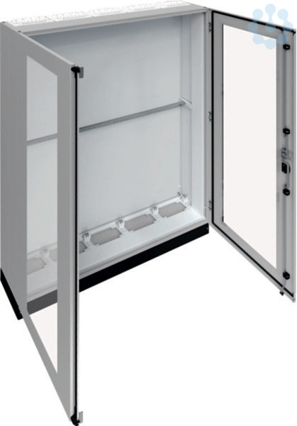 Schrank, univers, IP55/II, 1850x1300x275mm + 100mm Sockel. Einzelstandverteiler für die Innenraummontage mit VDE-Gutachten (Fertigungsüberwachung) nach DIN EN 61439-1/-2/-3 und Maßnorm DIN 43 870, zur Aufputz Montage. Zum Aufbau einer Niederspannungsverteilung bis 800 A, 3AC 230/400 V 50 Hz. Schutzart IP55, Schutzklasse I oder II, Luft- und Kriechstrecken nach DIN VDE 0110-1/-2. Bestehend aus Schrank mit Tür aus pulverbeschichtetem, eingebranntem, profiliertem 1,5 mm dicken Stahlblech. Durchsteckflansche oben, unten offen (Leitungseinfügungen einbaubar). Sammelschienendurchführungen als seitliche Vorprägung. Tür aufliegend, mit innen liegenden Scharnieren, Türanschlag standardmäßig rechts, wechselbar, mit 110 Grad Öffnungswinkel. Serienmässig mit Schwenkhebelverschluss, DIN-Profil-Halbzylinder einbaubar. Waagerechte Abfangschiene zur stabilisierung im Schrank enthalten. Türdichtung umlaufend geschäumt, temperaturbeständig und ölbeständig. Sockelleiste (Höhe 100 mm) serienmäßig montiert mit abnehmbarer Frontbl