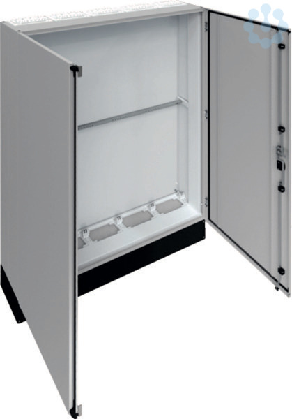 Schrank, univers, IP55/II, 1850x1300x275mm + 200mm Sockel. Einzelstandverteiler für die Innenraummontage mit VDE-Gutachten (Fertigungsüberwachung) nach DIN EN 61439-1/-2/-3 und Maßnorm DIN 43 870, zur Aufputz Montage. Zum Aufbau einer Niederspannungsverteilung bis 800 A, 3AC 230/400 V 50 Hz. Schutzart IP55, Schutzklasse I oder II, Luft- und Kriechstrecken nach DIN VDE 0110-1/-2. Bestehend aus Schrank mit Tür aus pulverbeschichtetem, eingebranntem, profiliertem 1,5 mm dicken Stahlblech. Durchsteckflansche oben, unten offen (Leitungseinfügungen einbaubar). Sammelschienendurchführungen als seitliche Vorprägung. Tür aufliegend, mit innen liegenden Scharnieren, Türanschlag standardmäßig rechts, wechselbar, mit 110 Grad Öffnungswinkel. Serienmässig mit Schwenkhebelverschluss, DIN-Profil-Halbzylinder einbaubar. Waagerechte Abfangschiene zur stabilisierung im Schrank enthalten. Türdichtung umlaufend geschäumt, temperaturbeständig und ölbeständig. Sockelleiste (Höhe 200 mm) serienmäßig montiert mit abnehmbarer Frontbl