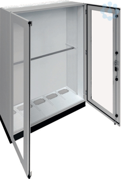 Schrank, univers, IP55/II, 1850x1300x400mm + 100mm Sockel. Einzelstandverteiler für die Innenraummontage mit VDE-Gutachten (Fertigungsüberwachung) nach DIN EN 61439-1/-2/-3 und Maßnorm DIN 43 870, zur Aufputz Montage. Zum Aufbau einer Niederspannungsverteilung bis 800 A, 3AC 230/400 V 50 Hz. Schutzart IP55, Schutzklasse I oder II, Luft- und Kriechstrecken nach DIN VDE 0110-1/-2. Bestehend aus Schrank mit Tür aus pulverbeschichtetem, eingebranntem, profiliertem 1,5 mm dicken Stahlblech. Durchsteckflansche oben, unten offen (Leitungseinfügungen einbaubar). Sammelschienendurchführungen als seitliche Vorprägung. Tür aufliegend, mit innen liegenden Scharnieren, Türanschlag standardmäßig rechts, wechselbar, mit 110 Grad Öffnungswinkel. Serienmässig mit Schwenkhebelverschluss, DIN-Profil-Halbzylinder einbaubar. Waagerechte Abfangschiene zur stabilisierung im Schrank enthalten. Türdichtung umlaufend geschäumt, temperaturbeständig und ölbeständig. Sockelleiste (Höhe 100 mm) serienmäßig montiert mit abnehmbarer Frontbl