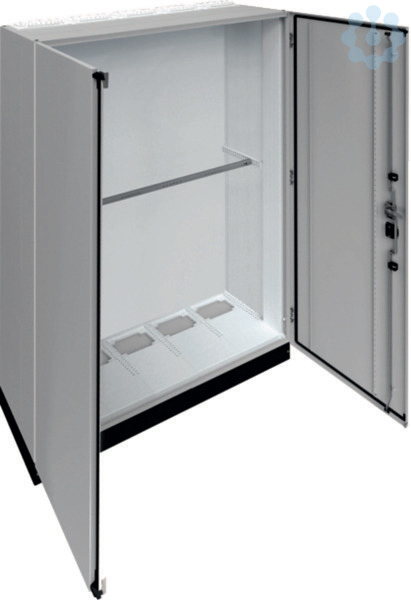 Schrank, univers, IP55/II, 1850x1300x400mm + 100mm Sockel. Einzelstandverteiler für die Innenraummontage mit VDE-Gutachten (Fertigungsüberwachung) nach DIN EN 61439-1/-2/-3 und Maßnorm DIN 43 870, zur Aufputz Montage. Zum Aufbau einer Niederspannungsverteilung bis 800 A, 3AC 230/400 V 50 Hz. Schutzart IP55, Schutzklasse I oder II, Luft- und Kriechstrecken nach DIN VDE 0110-1/-2. Bestehend aus Schrank mit Tür aus pulverbeschichtetem, eingebranntem, profiliertem 1,5 mm dicken Stahlblech. Durchsteckflansche oben, unten offen (Leitungseinfügungen einbaubar). Sammelschienendurchführungen als seitliche Vorprägung. Tür aufliegend, mit innen liegenden Scharnieren, Türanschlag standardmäßig rechts, wechselbar, mit 110 Grad Öffnungswinkel. Serienmässig mit Schwenkhebelverschluss, DIN-Profil-Halbzylinder einbaubar. Waagerechte Abfangschiene zur stabilisierung im Schrank enthalten. Türdichtung umlaufend geschäumt, temperaturbeständig und ölbeständig. Sockelleiste (Höhe 100 mm) serienmäßig montiert mit abnehmbarer Frontbl