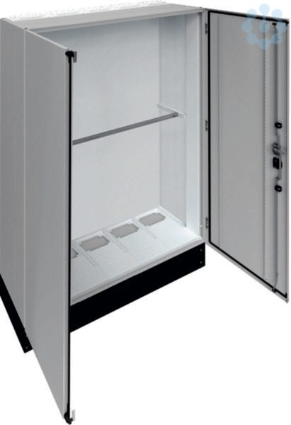 Schrank, univers, IP55/II, 1850x1300x400mm + 200mm Sockel. Einzelstandverteiler für die Innenraummontage mit VDE-Gutachten (Fertigungsüberwachung) nach DIN EN 61439-1/-2/-3 und Maßnorm DIN 43 870, zur Aufputz Montage. Zum Aufbau einer Niederspannungsverteilung bis 800 A, 3AC 230/400 V 50 Hz. Schutzart IP55, Schutzklasse I oder II, Luft- und Kriechstrecken nach DIN VDE 0110-1/-2. Bestehend aus Schrank mit Tür aus pulverbeschichtetem, eingebranntem, profiliertem 1,5 mm dicken Stahlblech. Durchsteckflansche oben, unten offen (Leitungseinfügungen einbaubar). Sammelschienendurchführungen als seitliche Vorprägung. Tür aufliegend, mit innen liegenden Scharnieren, Türanschlag standardmäßig rechts, wechselbar, mit 110 Grad Öffnungswinkel. Serienmässig mit Schwenkhebelverschluss, DIN-Profil-Halbzylinder einbaubar. Waagerechte Abfangschiene zur stabilisierung im Schrank enthalten. Türdichtung umlaufend geschäumt, temperaturbeständig und ölbeständig. Sockelleiste (Höhe 200 mm) serienmäßig montiert mit abnehmbarer Frontbl