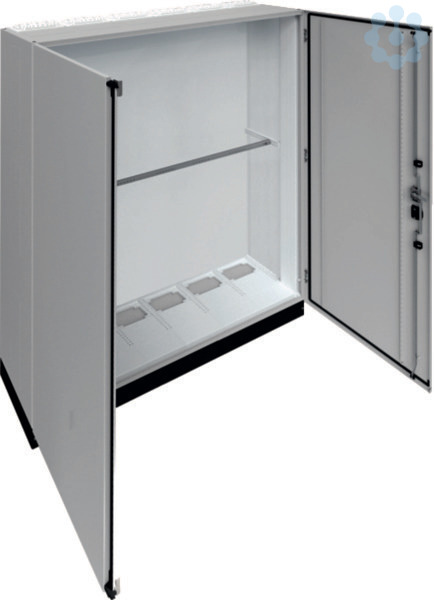 Schrank, univers, IP55/II, 1850x1550x400mm + 100mm Sockel. Einzelstandverteiler für die Innenraummontage mit VDE-Gutachten (Fertigungsüberwachung) nach DIN EN 61439-1/-2/-3 und Maßnorm DIN 43 870, zur Aufputz Montage. Zum Aufbau einer Niederspannungsverteilung bis 800 A, 3AC 230/400 V 50 Hz. Schutzart IP55, Schutzklasse I oder II, Luft- und Kriechstrecken nach DIN VDE 0110-1/-2. Bestehend aus Schrank mit Tür aus pulverbeschichtetem, eingebranntem, profiliertem 1,5 mm dicken Stahlblech. Durchsteckflansche oben, unten offen (Leitungseinfügungen einbaubar). Sammelschienendurchführungen als seitliche Vorprägung. Tür aufliegend, mit innen liegenden Scharnieren, Türanschlag standardmäßig rechts, wechselbar, mit 110 Grad Öffnungswinkel. Serienmässig mit Schwenkhebelverschluss, DIN-Profil-Halbzylinder einbaubar. Waagerechte Abfangschiene zur stabilisierung im Schrank enthalten. Türdichtung umlaufend geschäumt, temperaturbeständig und ölbeständig. Sockelleiste (Höhe 100 mm) serienmäßig montiert mit abnehmbarer Frontbl