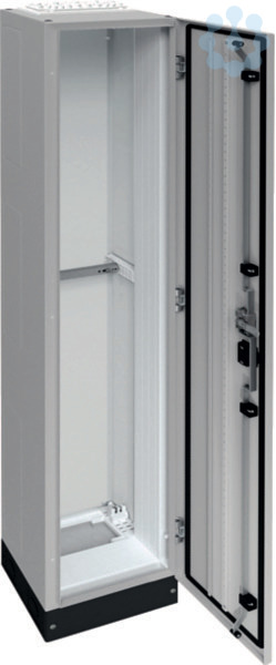 Schrank, univers, IP55/II, 1850x300x275mm + 100mm Sockel. Einzelstandverteiler für die Innenraummontage mit VDE-Gutachten (Fertigungsüberwachung) nach DIN EN 61439-1/-2/-3 und Maßnorm DIN 43 870, zur Aufputz Montage. Zum Aufbau einer Niederspannungsverteilung bis 800 A, 3AC 230/400 V 50 Hz. Schutzart IP55, Schutzklasse I oder II, Luft- und Kriechstrecken nach DIN VDE 0110-1/-2. Bestehend aus Schrank mit Tür aus pulverbeschichtetem, eingebranntem, profiliertem 1,5 mm dicken Stahlblech. Durchsteckflansche oben, unten offen (Leitungseinfügungen einbaubar). Sammelschienendurchführungen als seitliche Vorprägung. Tür aufliegend, mit innen liegenden Scharnieren, Türanschlag standardmäßig rechts, wechselbar, mit 110 Grad Öffnungswinkel. Serienmässig mit Schwenkhebelverschluss, DIN-Profil-Halbzylinder einbaubar. Waagerechte Abfangschiene zur stabilisierung im Schrank enthalten. Türdichtung umlaufend geschäumt, temperaturbeständig und ölbeständig. Sockelleiste (Höhe 100 mm) serienmäßig montiert mit abnehmbarer Frontble