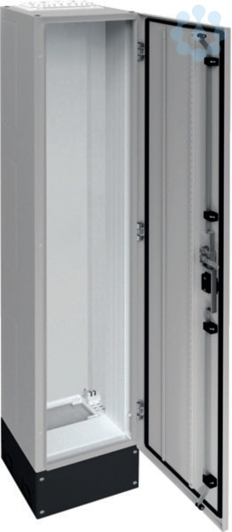 Schrank, univers, IP55/II, 1850x300x275mm + 200mm Sockel. Einzelstandverteiler für die Innenraummontage mit VDE-Gutachten (Fertigungsüberwachung) nach DIN EN 61439-1/-2/-3 und Maßnorm DIN 43 870, zur Aufputz Montage. Zum Aufbau einer Niederspannungsverteilung bis 800 A, 3AC 230/400 V 50 Hz. Schutzart IP55, Schutzklasse I oder II, Luft- und Kriechstrecken nach DIN VDE 0110-1/-2. Bestehend aus Schrank mit Tür aus pulverbeschichtetem, eingebranntem, profiliertem 1,5 mm dicken Stahlblech. Durchsteckflansche oben, unten offen (Leitungseinfügungen einbaubar). Sammelschienendurchführungen als seitliche Vorprägung. Tür aufliegend, mit innen liegenden Scharnieren, Türanschlag standardmäßig rechts, wechselbar, mit 110 Grad Öffnungswinkel. Serienmässig mit Schwenkhebelverschluss, DIN-Profil-Halbzylinder einbaubar. Waagerechte Abfangschiene zur stabilisierung im Schrank enthalten. Türdichtung umlaufend geschäumt, temperaturbeständig und ölbeständig. Sockelleiste (Höhe 200 mm) serienmäßig montiert mit abnehmbarer Frontble