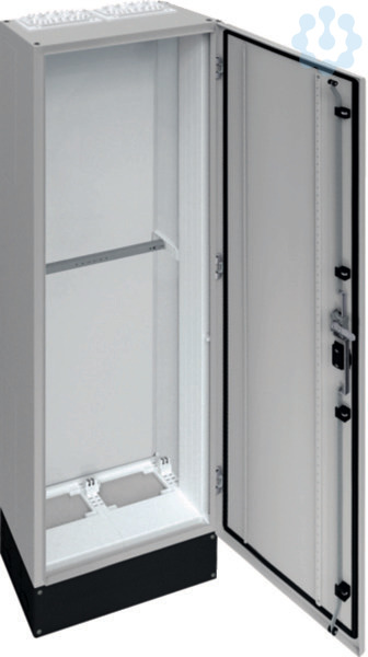 Schrank, univers, IP55/II, 1700x550x275mm + 200mm Sockel. Einzelstandverteiler für die Innenraummontage mit VDE-Gutachten (Fertigungsüberwachung) nach DIN EN 61439-1/-2/-3 und Maßnorm DIN 43 870, zur Aufputz Montage. Zum Aufbau einer Niederspannungsverteilung bis 800 A, 3AC 230/400 V 50 Hz. Schutzart IP55, Schutzklasse I oder II, Luft- und Kriechstrecken nach DIN VDE 0110-1/-2. Bestehend aus Schrank mit Tür aus pulverbeschichtetem, eingebranntem, profiliertem 1,5 mm dicken Stahlblech. Durchsteckflansche oben, unten offen (Leitungseinfügungen einbaubar). Sammelschienendurchführungen als seitliche Vorprägung. Tür aufliegend, mit innen liegenden Scharnieren, Türanschlag standardmäßig rechts, wechselbar, mit 110 Grad Öffnungswinkel. Serienmässig mit Schwenkhebelverschluss, DIN-Profil-Halbzylinder einbaubar. Waagerechte Abfangschiene zur stabilisierung im Schrank enthalten. Türdichtung umlaufend geschäumt, temperaturbeständig und ölbeständig. Sockelleiste (Höhe 200 mm) serienmäßig montiert mit abnehmbarer Frontble