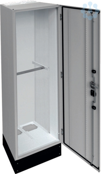Schrank, univers, IP55/II, 1850x550x400mm + 200mm Sockel. Einzelstandverteiler für die Innenraummontage mit VDE-Gutachten (Fertigungsüberwachung) nach DIN EN 61439-1/-2/-3 und Maßnorm DIN 43 870, zur Aufputz Montage. Zum Aufbau einer Niederspannungsverteilung bis 800 A, 3AC 230/400 V 50 Hz. Schutzart IP55, Schutzklasse I oder II, Luft- und Kriechstrecken nach DIN VDE 0110-1/-2. Bestehend aus Schrank mit Tür aus pulverbeschichtetem, eingebranntem, profiliertem 1,5 mm dicken Stahlblech. Durchsteckflansche oben, unten offen (Leitungseinfügungen einbaubar). Sammelschienendurchführungen als seitliche Vorprägung. Tür aufliegend, mit innen liegenden Scharnieren, Türanschlag standardmäßig rechts, wechselbar, mit 110 Grad Öffnungswinkel. Serienmässig mit Schwenkhebelverschluss, DIN-Profil-Halbzylinder einbaubar. Waagerechte Abfangschiene zur stabilisierung im Schrank enthalten. Türdichtung umlaufend geschäumt, temperaturbeständig und ölbeständig. Sockelleiste (Höhe 200 mm) serienmäßig montiert mit abnehmbarer Frontble