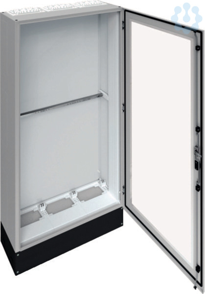 Schrank, univers, IP55/II, 1850x800x275mm + 200mm Sockel. Einzelstandverteiler für die Innenraummontage mit VDE-Gutachten (Fertigungsüberwachung) nach DIN EN 61439-1/-2/-3 und Maßnorm DIN 43 870, zur Aufputz Montage. Zum Aufbau einer Niederspannungsverteilung bis 800 A, 3AC 230/400 V 50 Hz. Schutzart IP55, Schutzklasse I oder II, Luft- und Kriechstrecken nach DIN VDE 0110-1/-2. Bestehend aus Schrank mit Tür aus pulverbeschichtetem, eingebranntem, profiliertem 1,5 mm dicken Stahlblech. Durchsteckflansche oben, unten offen (Leitungseinfügungen einbaubar). Sammelschienendurchführungen als seitliche Vorprägung. Tür aufliegend, mit innen liegenden Scharnieren, Türanschlag standardmäßig rechts, wechselbar, mit 110 Grad Öffnungswinkel. Serienmässig mit Schwenkhebelverschluss, DIN-Profil-Halbzylinder einbaubar. Waagerechte Abfangschiene zur stabilisierung im Schrank enthalten. Türdichtung umlaufend geschäumt, temperaturbeständig und ölbeständig. Sockelleiste (Höhe 200 mm) serienmäßig montiert mit abnehmbarer Frontble