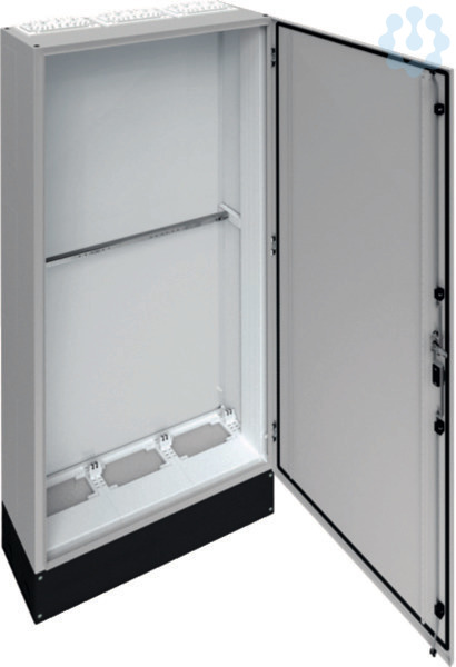 Schrank, univers, IP55/II, 1850x800x275mm + 200mm Sockel. Einzelstandverteiler für die Innenraummontage mit VDE-Gutachten (Fertigungsüberwachung) nach DIN EN 61439-1/-2/-3 und Maßnorm DIN 43 870, zur Aufputz Montage. Zum Aufbau einer Niederspannungsverteilung bis 800 A, 3AC 230/400 V 50 Hz. Schutzart IP55, Schutzklasse I oder II, Luft- und Kriechstrecken nach DIN VDE 0110-1/-2. Bestehend aus Schrank mit Tür aus pulverbeschichtetem, eingebranntem, profiliertem 1,5 mm dicken Stahlblech. Durchsteckflansche oben, unten offen (Leitungseinfügungen einbaubar). Sammelschienendurchführungen als seitliche Vorprägung. Tür aufliegend, mit innen liegenden Scharnieren, Türanschlag standardmäßig rechts, wechselbar, mit 110 Grad Öffnungswinkel. Serienmässig mit Schwenkhebelverschluss, DIN-Profil-Halbzylinder einbaubar. Waagerechte Abfangschiene zur stabilisierung im Schrank enthalten. Türdichtung umlaufend geschäumt, temperaturbeständig und ölbeständig. Sockelleiste (Höhe 200 mm) serienmäßig montiert mit abnehmbarer Frontble