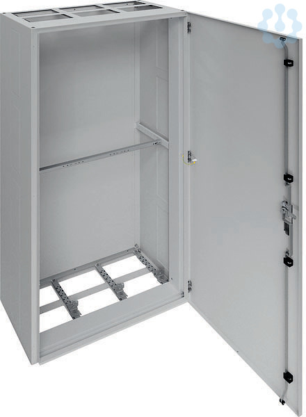 Schrank, univers, IP41, Schutzklasse I, 1850x800x400mm. Einzelstandverteiler für die Innenraummontage mit VDE-Gutachten (Fertigungsüberwachung) nach DIN EN 61439-1/-2/-3 und Maßnorm DIN 43 870, zur Aufputz Montage. Zum Aufbau einer Niederspannungsverteilung bis 800 A, 3AC 230/400 V 50 Hz. Schutzart IP41, Schutzklasse I, Luft- und Kriechstrecken nach DIN VDE 0110-1/-2. Bestehend aus Schrank mit Tür aus pulverbeschichtetem, eingebranntem, profiliertem 1,5 mm dicken Stahlblech. Leitungseinführungen oben und unten vorbereitet für ISO-Flanschplatten 1x pro Feld. Sammelschienendurchführungen als seitliche Vorprägung. Tür aufliegend, mit innen liegenden Scharnieren, Türanschlag standardmäßig rechts, wechselbar, mit 110 Grad Öffnungswinkel, Drei-Punkt-Verschluss serienmäßig. Hinweis: Wand- und Bodenbefestigung notwendig! Türverschluß durch andere Schließungen austauschbar. Schrank nebeneinander anflanschbar.