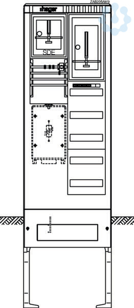 Straßenbeleuchtungsanschlusssäule, universZ, 1 Zählerplatz, 1 SDE, 1 Verteiler. Bestückte Straßenbeleuchtungsanschlusssäule nach DIN EN 61439, Schutzart IP 44, mit Eingrabsockel, aus glasfaserverstärktes Polyester FS 833.5 nach DIN EN 14598. Straßenbeleuchtungsanschlusssäule ist nach den aktuellen technischen Anschlussbedingungen des jeweiligen Energieversorgers bestückt und deckt die jeweiligen TAB-Anforderungen ab. Profiliertes Gehäuse im Rippendesign. Tür mit Öffnungswinkel 180 Grad bei freiem Stand und 90 Grad bei angereihten Gehäusen. Rechte Tür ist aushängbar. Schließung mit Schwenkhebel und Drei-Punkt-Basküleverschluss mit 1 bzw. 2 Profilhalbzylindern. Eingebauter Zylinder unten mit gleichschließender Serie. Ein zweiter Schließzylinder (z. B. aus VNB-Schließanlage) kann oben nach Entfernen des Vierkantverschlusses eingebaut werden. Wenn kein zweiter Profilhalbzylinder eingebaut wird, muss die zweite obere Öffnung mit einem Blindverschluss bestückt werden. Die Belüftung erfolgt über labyrinthartig ausge