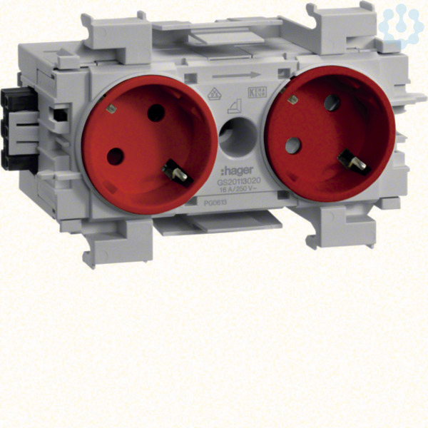 Steckdose 2-fach 45° mit Wago Steck-/Klemmtechnik Frontrastend in verkehrsrot. Kanalsteckdose 2-fach mit erhöhtem Berührungsschutz, Steckdosentopf 45 Grad, vorverdrahtet, mit Schnellbefestigung für frontrastender Geräteeinbau, anreihbar durch 3-poliges Steckverbindersystem. Leitungsanschluss über Steckklemmen 1,5 - 2,5 mm² oder über verpolungssicheres Steckverbindersystem.