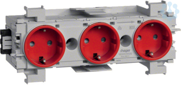 Steckdose 3-fach mit Wago Steck-/Klemmtechnik Frontrastend in verkehrsrot. Kanalsteckdose mit erhöhtem Berührungsschutz, vorverdrahtet, anreihbar durch 3-poliges Steckverbindersystem mit Schnellbefestigung für frontrastender Geräteeinbau. Leitungsanschluss über Steckklemmen 1,5 - 2,5 mm² oder über verpolungssicheres Steckverbindersystem.
