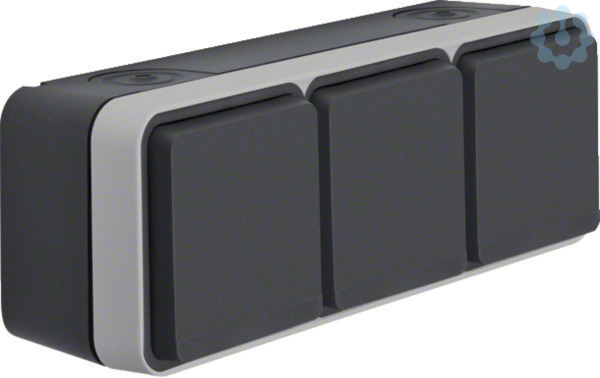 Steckd. SCHUKO 3f. waager. m. Klappd. AP, Steckkl., W.1, grau/lichtgr. matt. Steckdose SCHUKO® 3-fach waagerecht mit Klappdeckel AP, IP55. Für waagerechte Montage, Einsätze durchverdrahtet, mit Steckklemmen, mit einer Einführung für 2 Leitungen und einer Einführung für Leitung oder Rohr, vollflächige Dichtung unter dem Gehäuseboden zur Abdichtung der Gehäuserückseite, mit zufallendem Klappdeckel, manuell einrastbar, um den Schutzgrad IP55 zu erreichen, gut zugängliche, trichterförmige Montagelöcher in den Gehäusen, eine Wago 2-Leiter Verbindungsklemme für Verdrahtung beiliegend, zwei Einrastplätze für Wago 2-Leiter Verbindungsklemmen im Gehäuseboden, viel Platz zur Verdrahtung unter den Sockeln der Einsätze (Hohlboden), einfache Montage des Einsatzes im Gehäuse durch Einrasten, sichere Fixierung des Rahmens am Gehäuse über Bajonett-Schnellverschluss, Verbindungsklemmen nach VDE 0620-1, Bauart DIN 49440. Gehäuseschrauben und Klappdeckelfedern aus Edelstahl Rostfrei. Aufputz-Installation. Material: Kunststoff,