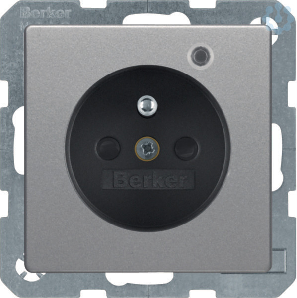 Steckdose mit Schutzkontaktstift und Kontroll-LED Q.1/Q.3 alu samt, lackiert. Steckdose mit Schutzkontaktstift und Kontroll-LED 2-polig + Erde, mit Schraub-Liftklemmen, Kontroll-LED leuchtet bei anliegender Netzspannung, zuverlässige Spannungsanzeige durch Unempfindlichkeit gegen Scheinspannungen, mit erhöhtem Berührungsschutz. Unterputz-Installation, Flächenprogramm. Material: Kunststoff, Thermoplast, bruchsicher, halogenfrei.