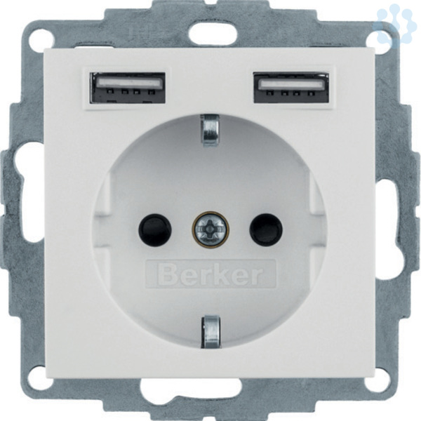 Steckdose SCHUKO/USB, Q.1/Q.3/Q.7/Q.9, polarweiß samt. Steckdose SCHUKO mit 2 USB-Buchsen Typ A zum Laden mobiler Endgeräte, wie z.B. Tablets, Smartphones, Navigationsgeräte und Digitalkameras über USB-Kabel, kurzschlussfest und überlastsicher (elektronische Sicherung), für Unterputz- und Hohlwandmontage, mit Steckklemmen.Steckdose SCHUKO mit 2 USB-Buchsen Typ A zum Laden mobiler Endgeräte, wie z.B. Tablets, Smartphones, Navigationsgeräte und Digitalkameras über USB-Kabel, kurzschlussfest und überlastsicher (elektronische Sicherung), für Unterputz- und Hohlwandmontage, mit Steckklemmen.