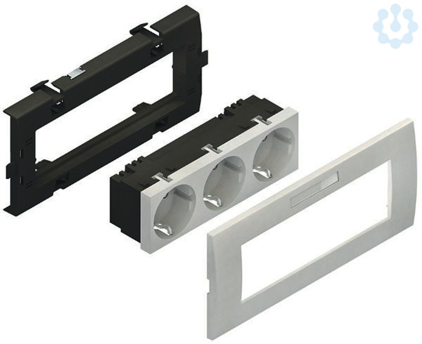 Set besteht aus : 1 x Geräteadapter, dreifach, Modul 45, mit 2 Federclips 1 x Steckdoseneinsatz, dreifach, waagerecht, mit Steckklemmen für Leitungen 1,5 - 2,5 mm², 2-polig, mit Berührungsschutz 1 x Abdeckrahmen, dreifach, Modul 45, einschl. Sichtfenster mit Etikett für Beschriftungsfeld 1 x Montageanleitung.