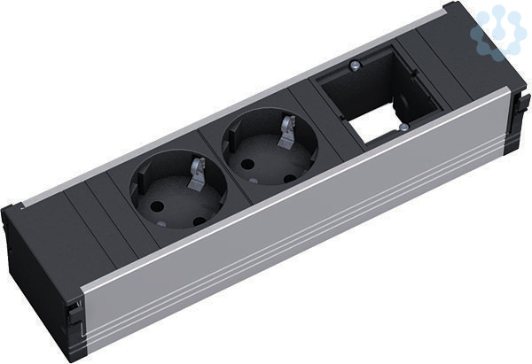 CONI Steckdoseneinheit ALU mit erhöhtem Berührungsschutz. Länge: 3-fach / 217mm 2xSchutzkontaktsteckdose sw. 1xCustom Modul leer. Stromeingang: 0,20m H05VV-F 3G1,50mm² schwarz mit Wieland GST18 Steckverbinder.