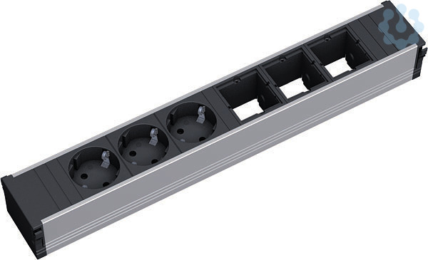 CONI Steckdoseneinheit ALU Länge: 6-fach ca.356mm mit erhöhtem Berührungsschutz. 3xSchutzkontaktsteckdose sw. 3xCustom Modul leer Stromeingang: 0,2m H05VV-F 3G1,50mm² schwarz mit Wieland GST18 Steckverbinder.