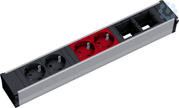 CONI Steckdoseneinheit ALU Länge: 6-fach / 356mm mit erhöhtem Berührungsschutz. 2xSchutzkontaktsteckdose 35° sw. 2xSchutzkontaktsteckdose 35° rt. 2xCustom Module leer. Stromeingang: 1x0,20m H05VV-F 3G1,50mm² sw mit Wieland GST18 Steckverbinder sw. 1x0,20m H05VV-F 3G1,50mm² rot mit Wieland GST18 Steckverbinder schwarz.