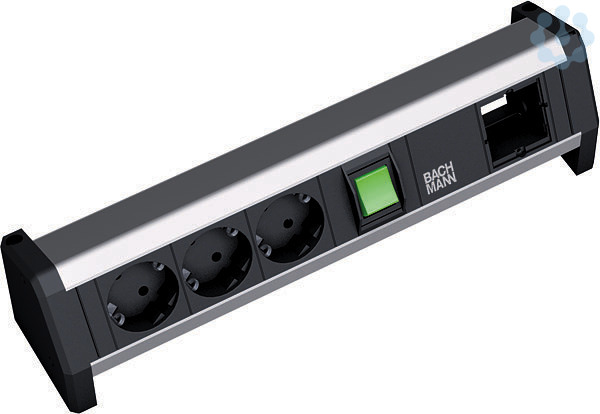 DESK Steckdoseneinheit ALU mit erhöhtem Berührungsschutz. 1xSchalter beleuchtet 2-polig, schaltet Steckdosen und Stromausgang. 3xSchutzkontaktsteckdose sw. 1xCustom Modul leer GST18 Stromein- und ausgang.