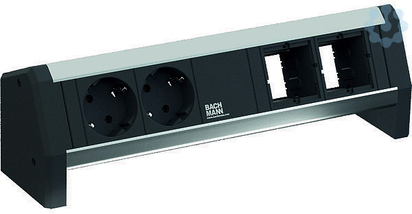 DESK Steckdoseneinheit Aluminium mit erhöhtem Berührungsschutz, 2xSchutzkontaktsteckdose schwarz. 2xCustom Module leer. GST18 Stromein- und ausgang.