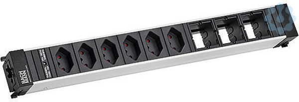CONFERENCE Steckdoseneinheit ALU Länge: 444mm 6xCH/Schweiz sw. mit Thermosicherung 10A 3xCustom Module leer. Stromein- und ausgang GST18