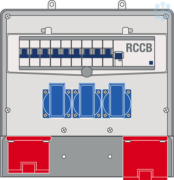 Die Steckdosenkombination für Wandmontage ist anschlussfertig verdrahtet. Jede Kombination, einschließlich der Einbaugeräte, ist stückgeprüft nach EN 61439-3. Die gesamte Kombination ist spritzwassergeschützt nach IP 44. Das Gehäuse wird aus dem Kunststoff Polyamid gefertigt. Dieser hochwertige Kunststoff zeichnet sich besonders durch seine hervorragende Festigkeit und Zähigkeit aus. Die Gehäusefarbe ist lichtgrau (elektrograu). Ohne Einbauten hat die Kombination die Abmessung von (HxBxT) 294 x 292 x 109 mm. Unterhalb eines Klarsichtfensters befinden sich die Reiheneinbaugeräte, die auf einer Tragschiene für 13 Teilungseinheiten montiert sind. Das Klappfenster ist selbstschließend und plombierbar. Die Bestückung und Absicherung setzt sich wie folgt zusammen: 1 x CEE-Steckdosen 5/32 A, 1 x CEE-Steckdosen 5/16 A, 3 x SCHUKO-Steckdosen, 1 x FI-Schalter 4/40/0,0,3A, 1 x LS-Schalter 32A 3-pol. C, 1 x LS-Schalter 16A 3-pol. C, 3 x LS-Schalter 16A 1-pol. C. Das Gehäuse hat zwei Leitungseinführungen M40 oben, die mit