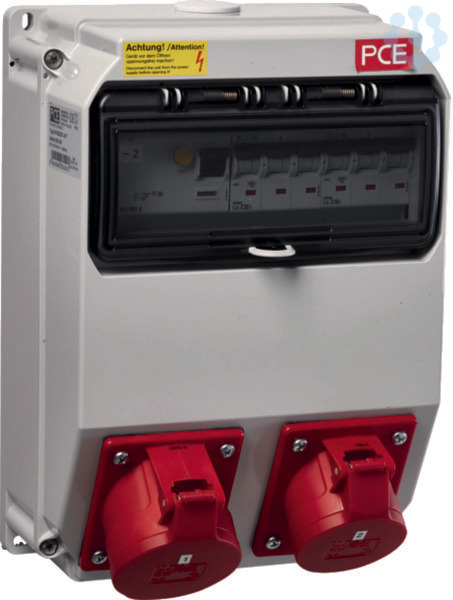 Steckdosenkombination, 1 CEE-Steckdose 16A, 5-pol., 1 CEE-Steckdose 32A, 5-pol. Steckdosenkombination für Stromverteilersäule rund für Fest- und Marktplätze, bestehend aus IP 44 Gehäuse mit Steckdosen, Leitungsschutzschaltern, Fehlerstromschutzschalter.