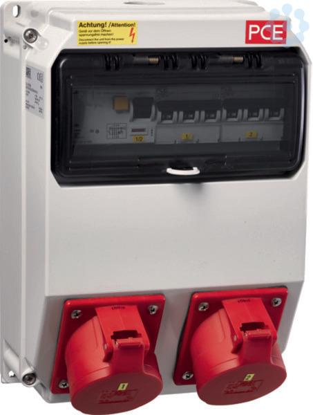 Steckdosenkombination, KVS, 2 x CEE 5-polig 32 A,IP44. Steckdosenkombination für Stromverteilersäule rund für Fest- und Marktplätze, bestehend aus IP 44 Gehäuse mit Steckdosen, Leitungsschutzschaltern, Fehlerstromschutzschalter.