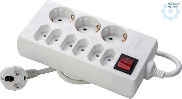 3+6-fach Steckdosenleiste, für sechs Euro-unddreiSchutzkontaktsteckdosen, mit 1-poligem beleuchtetem Schalter, mit 45° gedrehten Töpfen, mit erhöhtem Berührungsschutz, Zuleitung H05VV-F3Gx1,5mm², 1,4, 16A,250V~, Farbe: arktisweiß