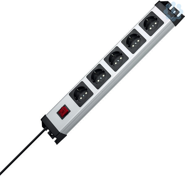 POWERversal 5-fach, 250V~, 16A, max.3600W, IP20, mit 2-poligem beleuchteten Schalter,mit erhöhtem Berührungsschutz, mit 90° gedrehten Töpfen, 65mm Topfabstand, anschraubbar, wiederanschließbar, Zuleitung H05VV-F3G1,5mm², 1,4m, Maße (lxbxh):(482,6x71x58,3)mm, silber-schwarz