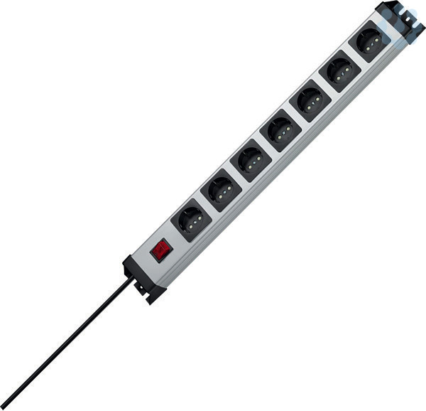 POWERversal 7-fach, 250V~, 16A, max.3600W, IP20, mit 2-poligem beleuchteten Schalter,mit erhöhtem Berührungsschutz, mit 90° gedrehten Töpfen, 65mm Topfabstand, anschraubbar, wiederanschließbar, Zuleitung H05VV-F3G1,5mm², 1,4m, Maße (lxbxh):(612,6x71x58,3)mm, silber-schwarz