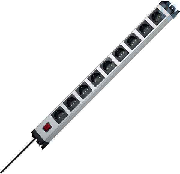 POWERversal 9-fach, 250V~, 16A, max.3600W, IP20, mit 2-poligem beleuchteten Schalter,mit erhöhtem Berührungsschutz, mit 90° gedrehten Töpfen, 65mm Topfabstand, anschraubbar, wiederanschließbar, Zuleitung H05VV-F3Gx1,5mm², 1,4m, Maße(lxbxh):(742,8x71x58,3)mm, silber-schwarz