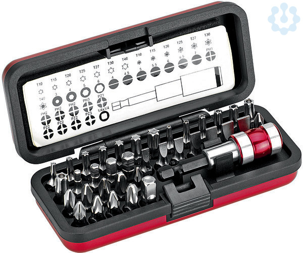 Steckschlüssel-Bit-Box, 37-teilig, In stabiler Aluminiumkassette. Länge: 130 mm, Gewicht: 320 g. Inhalt: Bithalter mit Schnellverschluss, 65 mm, 1/4?-Adapter zur Aufnahme von Steckschlüsseln, je ein Bit 1/4?, 25 mm lang: für Schlitzschrauben 4 - 4,5 - 5 - 5,5 - 6 - 6,5 - 7 mm, für Kreuzschlitzschrauben PH 1 - PH 3, für Kreuzschlitzschrauben PZ 1 - PZ 3, für Innensechskant 3 - 4 - 5 - 6 mm, für Torx t 10 - t 15 - t 20 - t 25 - t 27 - t 30 - t 40, für Torx mit Bohrung t 10 - t 15 - t 20 - t 25 - t 27 - t 30 - t 40, je drei Bits 1/4?, 25 mm lang: für Kreuzschlitzschrauben PH 2, für Kreuzschlitzschrauben PZ 2