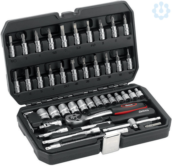 Steckschlüssel-Satz, 45-teiligin ansprechend kompakter Kunststoffbox, 6,3 mm (1/4?) Antrieb, ausChrom-Vanadium-Stahl, Einsätze in Sechskant für maximales Drehmoment. Hebelumschaltknarre mit Einsatzschnelllöser 72 Zähne. Sechskant Einsätze: 4 - 4,5 - 5 - 5,5 - 6 - 7 - 8 - 9 - 10 - 11 - 12 - 13 - 14 mm. Kreuzeinsatz PH 1 - PH 2 - PH 3 - PZ 1 - PZ 2 - PZ 3. Schlitzeinsatz 4 - 5,5 - 7 mm. T-Profileinsätze ohne Stirnloch T 10 - T 15 - T 20 - T 25 - T 30 - T 40. Innensechskanteinsätze 3 - 4 - 5 - 6 - 7 - 8 mm. Biegsame Welle 150 mm. Verlängerungen in 50 und 100 mm. Innensechskant-Winkelschlüssel 1,5 - 2 - 3 mm. Quergriff mit Gleitkopf 1/4?. Kardangelenk. Handgriff 1/4?. Adapter 1/4?