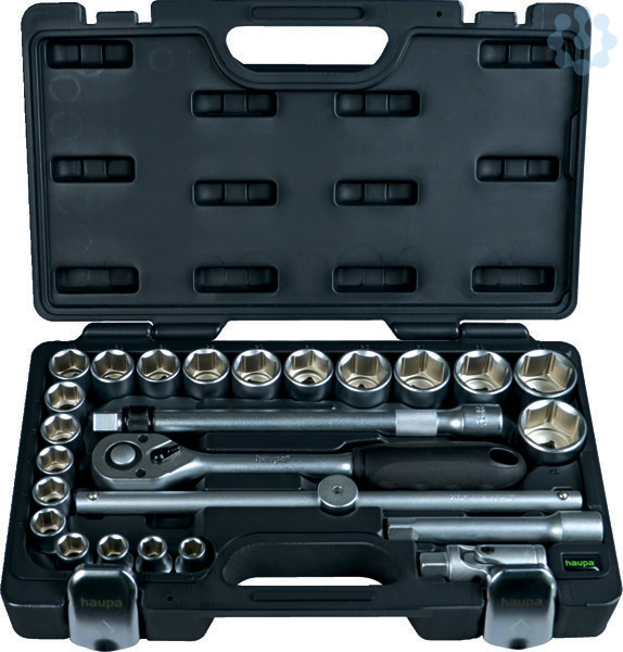 SteckschlüsselsatzChrom-Vanadium-Stahl, Industriequalität, schwarzer Kunststoffkoffer mit Metallverschluss. Inhalt: 1/2-Antrieb 20 Steckschlüsseleinsätze 10 - 11 - 12 - 13 - 14 - 15 - 16 - 17 - 18 - 19 - 20 - 21 - 22 - 23 - 24 - 26 - 27 - 28 - 30 - 32 mm, 1 Umschaltknarre, 2 Verlängerungen 125 mm und 250 mm arretierbar, 1 Kardangelenk, 1 Adapter 3/8? x 1/2? für Verlängerung zur Verwendung als T-Griff
