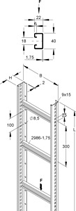 Steigetrasse nach DIN EN 61537, für die Wandmontage, mit durchgehend perforierten und profilierten Seitenholmen, mit eingenieteten Sprossen aus C-Profilen mit 18 mm Schlitzweite. Passende Bügelschellen (BU... und BUK...). Zur Verwendung im Funktionserhalt bitte Zusatzvorschriften beachten! Abmessungen (ca. Maße) H x B : 60 x 400 mm Materialstärke Holm : 2 mm Sprossenabstand : 300 mm Seitenholmlochung : 9 x 15 mm mittiger Abstand : 25 mm Bodenlochung : Ø 8,5 mm und Ø 5,4 mm mittiger Abstand : 100 mm und 50 mm Tragfähigkeit bei B/2 : 1,75 kN Lieferlänge L : 3000 mm Transportlänge : 3000 mm + B Nutzbarer Querschnitt : 14200 mm² Werkstoff : Stahl, bandverzinkt nach DIN EN 10346