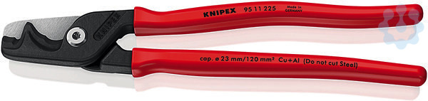 95 11 225 KNIPEX StepCut XL Mit Kraftgelenk, langen Schenkeln und optimierten Schneiden: spürbar leichterer Schnitt als mit kompakten Kabelscheren. Enorme Kapazität: trennt eindrähtige Kabel aus Kupfer oder Aluminium bis 35 mm², mehrdrähtig bis 70 mm² und feindrähtig bis 120 mm². Zwei Schneidbereiche: Die abgestufte Hauptschneide hält kleinere und größere Kabel beim Schnitt stets maximal gelenknah, die Frontschneide dient zum schrittweisen Trennen (?Knabbern?) sehr großer Kabel. Komfortable Einhand- und Zweihandbedienung auch bei großen Kabeldurchmessern durch minimierte Schenkelweite. Geschraubtes Kraftgelenk: hochübersetzt, leichtgängig, nachstellbar. Schlanker Kopf für bessere Zugänglichkeit. Klemmschutz für sicheres Arbeiten. Nicht geeignet für stahlverstärkte Kabel, etwa ACSR. Schneiden zusätzlich lasergehärtet, Schneidenhärte ca. 56 HRC..