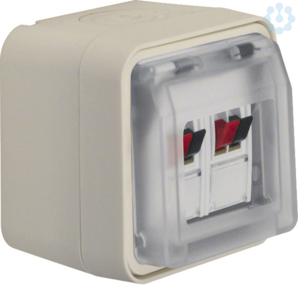 Stereo-Lautsprecher-Anschlussdose AP W.1 polarweiß. Stereo Lautsprecher-Anschlussdose mit Klappdeckel AP, mit Beschriftungsfeldern, IP55, mit Steckklemmen (beidseitig), mit einer Einführung für 2 Leitungen und einer Einführung für Leitung oder Rohr, vollflächige Dichtung unter dem Gehäuseboden zur Abdichtung der Gehäuserückseite, mit transparentem, zufallendem Klappdeckel, manuell einrastbar, um den Schutzgrad IP55 zu erreichen, gut zugängliche, trichterförmige Montagelöcher in den Gehäusen, einfache Montage des Einsatzes im Rahmen mit Klappdeckel durch Einrasten, sichere Fixierung des Rahmens mit Klappdeckel am Gehäuse über Bajonett-Schnellverschluss.