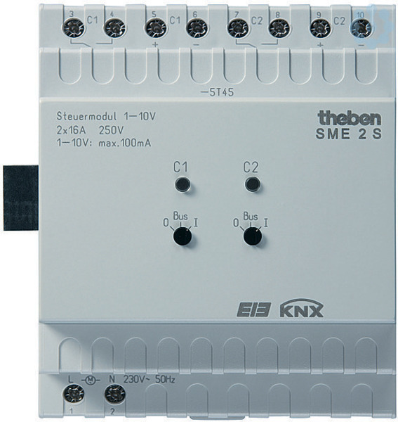 KNX 2 Kanal Steuereinheit ermöglicht in Verbindung mit elektronischen Vorschaltgeräten(EVGs) das Schalten und Dimmen von Lichtstromkreisen, Erweiterung von SMG 2 bis zu 6 Kanäle oder kombinierbar mit anderen Geräten der MIX-Serie, Reiheneinbaugehäuse Breite 4 TE, 2 Relais-Schaltausgänge, Nennspannung 230V mit Nulldurchgangsschaltung sowie pro Kanal einen 1-10 V Ausgang, Merkmale: Diagnose und Rückmeldeobjekt für jeden Kanal, Handschalter für EIN, AUS, BUS auch ohne Busspannung, Verhalten bei Busausfall sowie Bus-oder Netzwiederkehr einstellbar