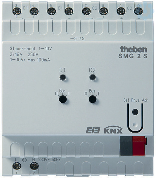 KNX 2 Kanal Steuereinheit ermöglicht in Verbindung mit elektronischen Vorschaltgeräten(EVGs) das Schalten und Dimmen von Lichtstromkreisen, erweiterbar mit SME 2 bis zu 6 Kanäle oder mit anderen Geräten der MIX-Serie kombinierbar, Reiheneinbaugehäuse Breite 4 TE, 2 Relais-Schaltausgänge, Nennspannung 230V mit Nulldurchgangsschaltung sowie pro Kanal einen 1-10 V Ausgang, Merkmale: Diagnose und Rückmeldeobjekt für jeden Kanal, Handschalter für EIN, AUS, BUS auch ohne Busspannung, Verhalten bei Busausfall sowie Bus-oder Netzwiederkehr einstellbar