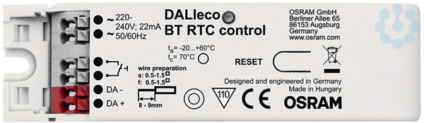 Einstellung der Farbtemperatur. Bis zu 4 Gruppen getrennt ansteuerbar. Produktfamilien-Eigenschaften: Kompaktes Lichtsteuergerät mit DALI-Schnittstelle. Smartphoneanbindung mit Bluetooth® Anbindung zum Steuern und Anpassen. Integrierte Uhr zur zeitgesteuerten Helligkeits- und Farbtemperatursteuerung (HCL). Anpassbare HCL Kennlinie mit bis zu 24 Punkten. Ein DALI-Ausgangskanal (Broadcast oder Groupcast). Bis zu 32 DALI-Leuchten anschließbar. Unterstützt bis zu 4 OSRAM DALI Sensoren und Tasterkoppler. Tageslichtabhängige Regelung und präsenzabhängige Lichtsteuerung. Tasterschnittstelle für getrenn