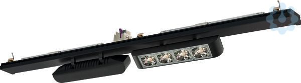 Strahlermoduleinsatz REY-2 zur Montage in Tragschiene VLTM in Kombination mit Geräteträgern VLGF.... Zusatzmodul VLMF ... aus Aluminiumprofil, stranggepresst, weiß bzw. schwarz (-SW) pulverbeschichtet. Federstahlklammern für die Befestigung an der Tragschiene. Die Module VLMF ... können variabel zwischen den Geräteträgern VLGF ... platziert werden. Elektrischer Adapter zum flexiblen Abgriff der Stromführung in der Tragschiene. Farbliche und optische Codierung zur einfachen Montage. Mechanische Codierung zur Vermeidung von Fehlmontage (Verdrehschutz). Zwei asymmetrisch angeordnete LED-Strahlergehäuse aus Aluminiumdruckguss, weiss (ähnlich RAL9016), bzw. schwarz (ähnlich RAL9005) pulverbeschichtet. Lichteinheiten über Kipp-Gelenk an dem Geräteträger mit integriertem LED-Treiber angebracht. Lichteinheiten um 80° schwenkbar für eine flexible Anwendung. Strahler mit jeweils 4 LED-COB-Modulen ausgestattet für hohe Lichtströme. Die speziell für die Regalbeleuchtung entwickelten, hochwertigen Optiken in Form von TIR-