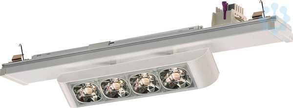 Strahlermoduleinsatz REY-1 zur Montage in Tragschiene VLTM in Kombination mit Geräteträgern VLGF.... Zusatzmodul VLMF ... aus Aluminiumprofil, stranggepresst, weiß bzw. schwarz (-SW) pulverbeschichtet. Federstahlklammern für die Befestigung an der Tragschiene. Die Module VLMF ... können variabel zwischen den Geräteträgern VLGF ... platziert werden. Elektrischer Adapter zum flexiblen Abgriff der Stromführung in der Tragschiene. Farbliche und optische Codierung zur einfachen Montage. Mechanische Codierung zur Vermeidung von Fehlmontage (Verdrehschutz). LED-Strahlergehäuse aus Aluminiumdruckguss, weiss (ähnlich RAL9016), bzw. schwarz (ähnlich RAL9005) pulverbeschichtet. Lichteinheit über Kipp-Gelenk an dem Geräteträger mit integriertem LED-Treiber angebracht. Lichteinheit um 80° schwenkbar für eine flexible Anwendung. Strahler mit 4 LED-COB-Modulen ausgestattet für hohe Lichtströme. Die speziell für die Regalbeleuchtung entwickelten, hochwertigen Optiken in Form von TIR-Linsen sorgen für eine effiziente Lichtlen
