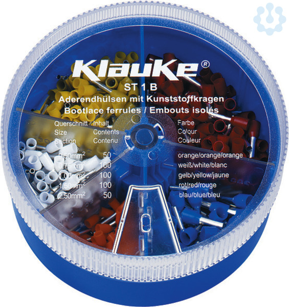 Streudose aus schlagfestem Kunststoff. Stapelbar und wiederverschließbar. Lieferumfang: Streudose (ST1L) 1 Stück, isol. Aderendhülse DIN 46228 Teil 4, 0,5 mm², 14mm Länge (169O) 50 Stück, isol. Aderendhülse DIN 46228 Teil 4, 0,75 mm², 14,6mm Länge (170W) 100 Stück, isol. Aderendhülse DIN 46228 Teil 4, 1 mm², 14,6mm Länge (171G) 100 Stück, isol. Aderendhülse DIN 46228 Teil 4, 1,5 mm², 14,6mm Länge (172RO) 100 Stück, isol. Aderendhülse DIN 46228 Teil 4, 2,5 mm², 15,2mm Länge (173B) 50 Stück.