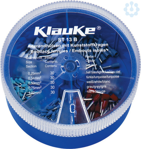 Streudose aus schlagfestem Kunststoff. Stapelbar und wiederverschließbar. Artikel-Nr. 167H und 168T sind nicht genormt, Lieferumfang: Streudose (ST13L) 1 Stück, isol. Aderendhülse, 0,25 mm², 10,4mm Länge (167H) 30 Stück, isol. Aderendhülse 0,34 mm², 10,4mm Länge (168T) 30 Stück, isol. Aderendhülse DIN 46228 Teil 4, 0,5 mm², 14mm Länge (4698) 30 Stück, isol. Aderendhülse DIN 46228 Teil 4, 0,75 mm², 14mm Länge (4708) 30 Stück, isol. Aderendhülse DIN 46228 Teil 4, 1 mm², 14mm Länge (4718) 30 Stück.