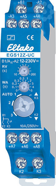 Aktor UC. Stromstoß-Gruppenschalter für Zentralsteuerung für 1 Motor oder für Motor-Relais. Stand-by-Verlust nur 0,05 bis 0,4 Watt. Dieser Stromstoß-Gruppenschalter setzt die Befehle der Sensorrelais oder von Schaltern und Tastern um und schaltet je nach Einstellung der Drehschalter auf der Frontseite einen Motor, Motor-Trennrelais MTR12-UC oder DC-Motorrelais . Die Steuerspannung an den Klemmen A3 bis A8 muss das gleiche Potenzial wie die Versorgungsspannung haben. Das Funktionsprinzip dieses Stromstoß-Gruppenschalters besteht darin, dass einerseits impulsweise auf, halt, ab, halt (Kontakt 1 geschlossen - beide Kontakte geöffnet - Kontakt 2 geschlossen - beide Kontakte geöffnet) gesteuert werden kann, andererseits über zusätzliche Steuereingänge gezielt auf oder ab gewählt werden kann. Dynamisch bezeichnet Steuereingänge, bei denen ein Impuls von mind. 20ms genügt, um einen Kontakt zu schließen. Statisch ist ein Steuereingang, bei dem der Kontakt nur solange geschlossen ist, wie der Steuerbefehl anliegt. Die