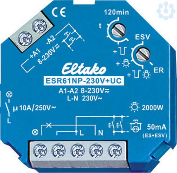 Stromstoß-Schaltrelais 230V+UC. 1 Schließer nicht potenzialfrei 10A/250V AC, Glühlampen 2000W, Rückfallverzögerung mit Ausschaltvorwarnung und Taster-Dauerlicht zuschaltbar. Stand-by-Verlust nur 0.7 Watt. Für Einbaumontage. 45mm lang, 45mm breit, 18mm tief. Kontaktschaltung im Nulldurchgang zur Schonung der Kontakte und Lampen, insbesondere verlängert dies die Lebensdauer von Energiesparlampen. Modernste Hybrid-Technik vereint die Vorteile verschleißfreier elektronischer Ansteuerung mit der hohen Leistung von Spezialrelais. Durch die Verwendung eines bistabilen Relais gibt es auch im eingeschalteten Zustand keine Spulen-Verlustleistung und keine Erwärmung hierdurch. Nach der Installation die automatische kurze Synchronisation abwarten, bevor der geschaltete Verbraucher an das Netz gelegt wird. Steuerspannung 230V, zusätzlich mit galvanisch getrennter Universal-Steuerspannung 8..230V UC. Versorgungs- und Schaltspannung 230V. Sehr geringes Schaltgeräusch. Zeiteinstellung bis 120 Minuten in der Funktion ESV. An